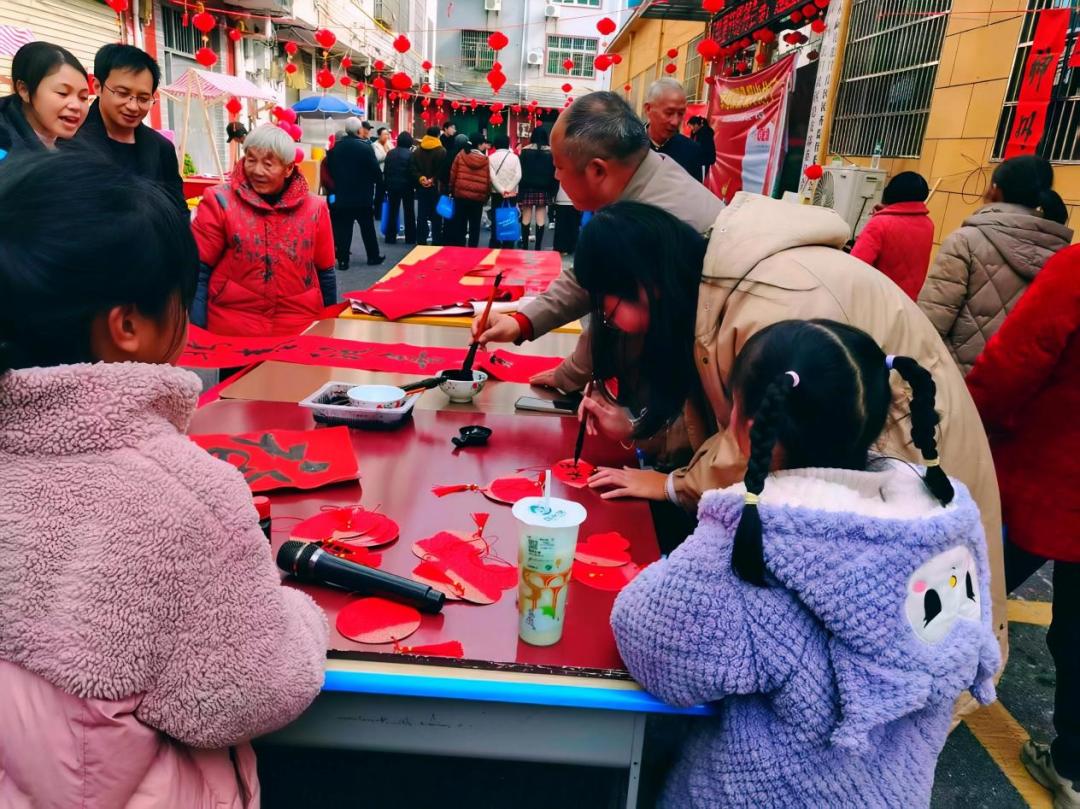 移步至墨香袅袅的写春联拓福区,暖意扑面而来。帮扶单位七溪林场的书法达人挥毫泼墨,一副副寓意吉祥的春联、一个个饱满喜庆的“福”字跃然纸上。社区干部们忙前忙后,铺纸、递墨、晾晒。“国泰民安逢盛世,风调雨顺兆丰年,这春联写得太合心意了!”家住建材街南区的王大爷捧着春联,笑容满面。一旁的拓福环节人气高涨,神墨教培的老师现场指导亲子家庭从铺纸、调墨到把控拓印力度。孩子们踮脚按压,家长们从旁协助,社区干部与老师不时俯身指导,一张张红底黑字的福字接连“出炉”,定格了干群同心、校社联动的温馨画面。