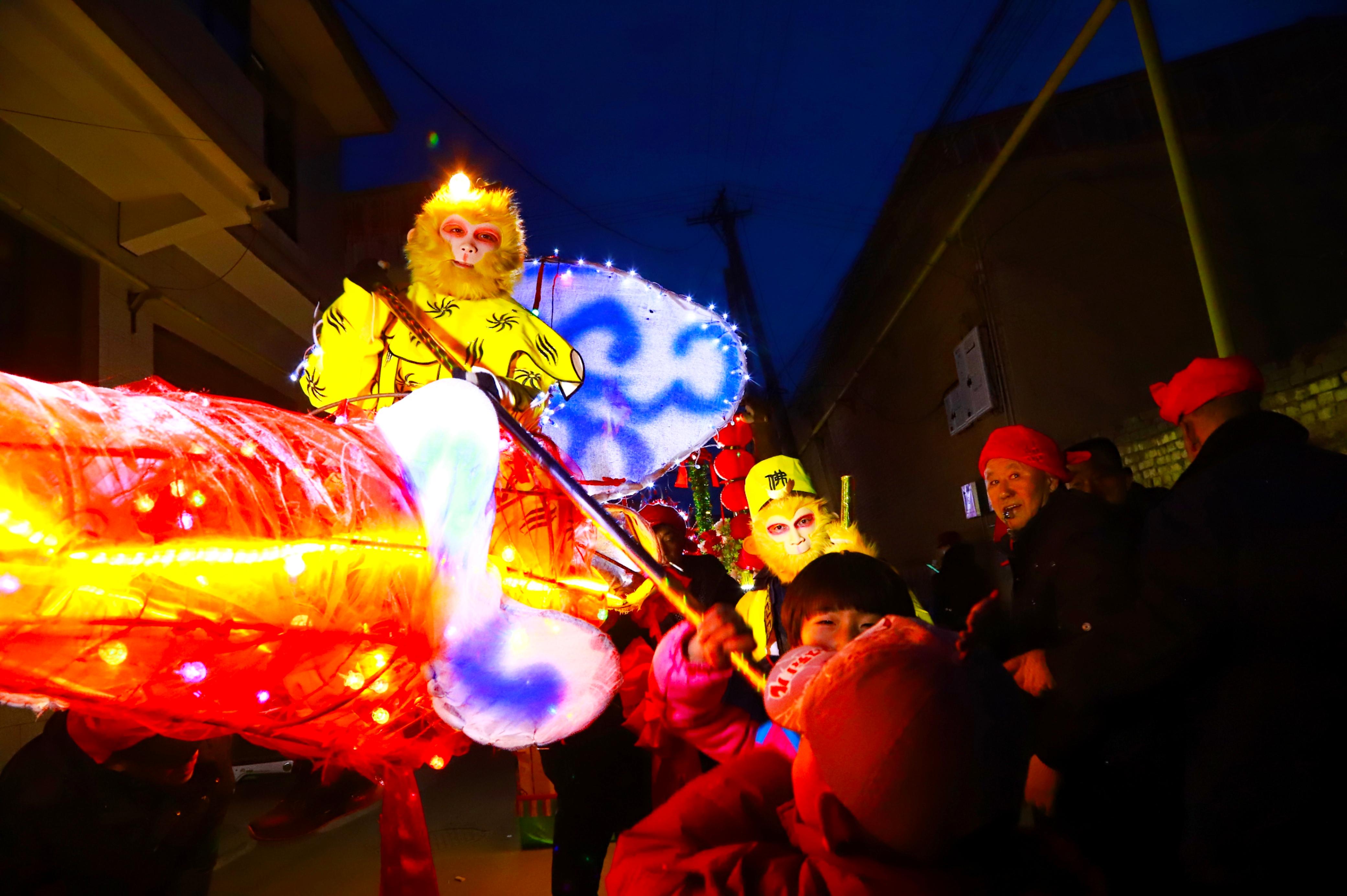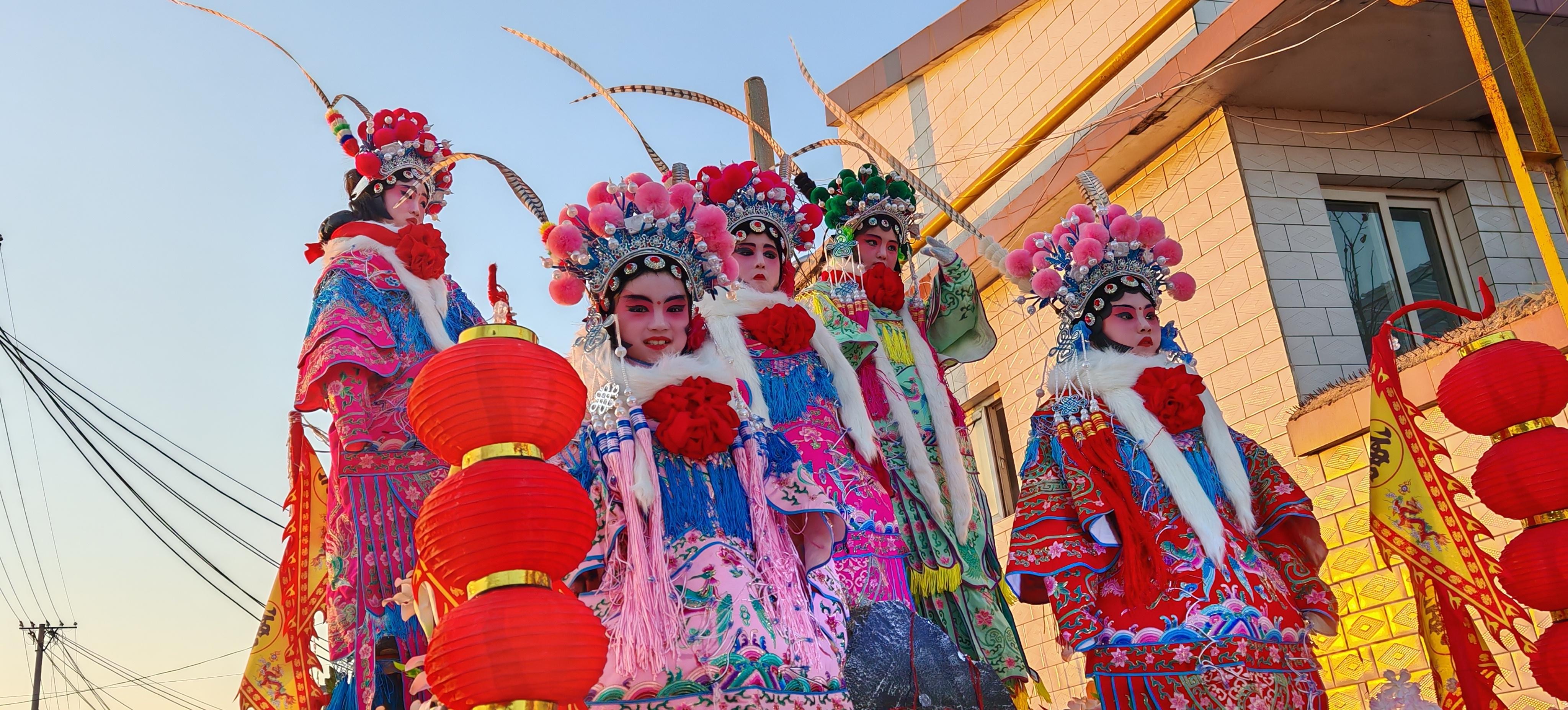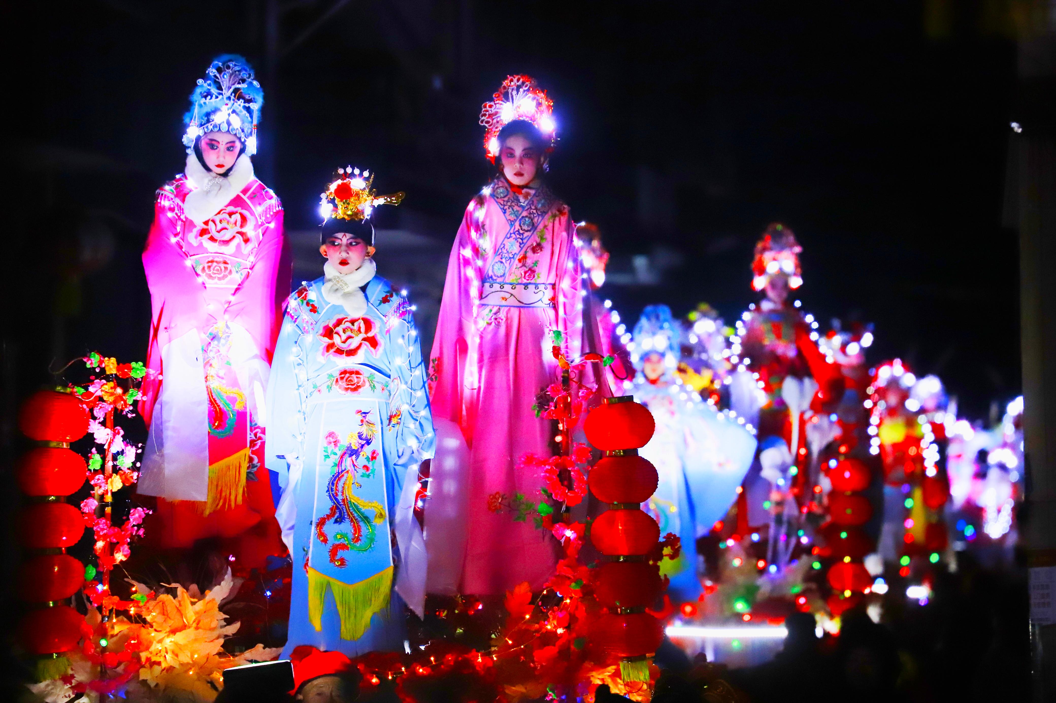 当第一盏宫灯在铁棍顶端亮起,村庄骤然跌入流光梦境。七架铁棍依次点亮檐角宫灯、腰间串灯与脚下射灯,暖黄光晕透过纱幔,将戏服刺绣映照得愈发鲜亮。抬棍后生身着青布衫,迈着整齐的“铁棍步”,脚步一颠一颤间,铁棍上的孩童展水袖、摇折扇,如空中芭蕾般风姿绰约。《算粮登殿》的薛平贵挥枪亮相,银枪上的LED灯带划出弧线;《五女拜寿》的众女簇拥着二老,灯影中尽显天伦之乐,戏曲的悲欢离合在流动中徐徐铺展。