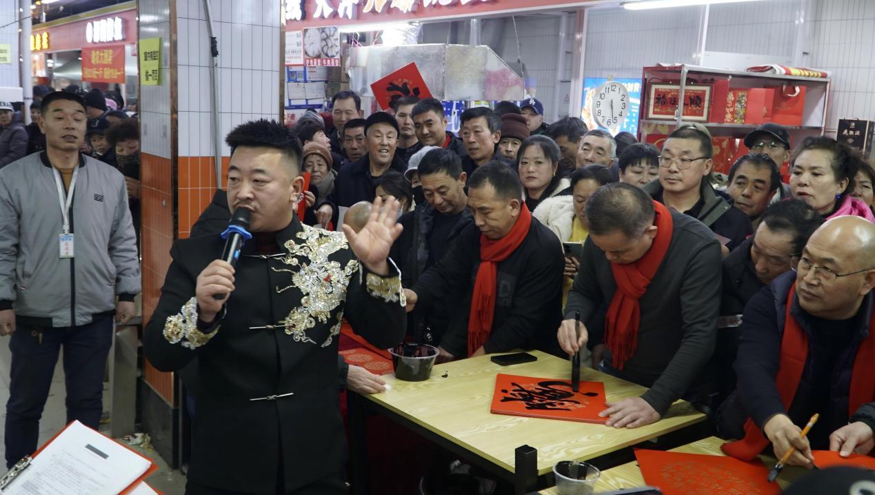 图为公益主播王子林现场直播20名书画家书写对联、福字免费送市民的场面