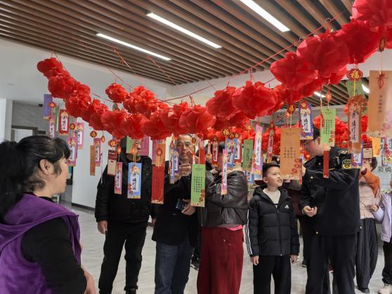 走进黄湓社区二楼活动区,百余盏红灯笼如繁星点点,将活动区装点得喜气洋洋。三五成群的居民或蹙眉凝思,或会心一笑——那是在猜灯谜的乐趣中寻找智慧的闪光。一位爷爷指着谜面,耐心地为孙子讲解着其中蕴含的典故,文化的薪火就在这口耳相传中悄然传递。
