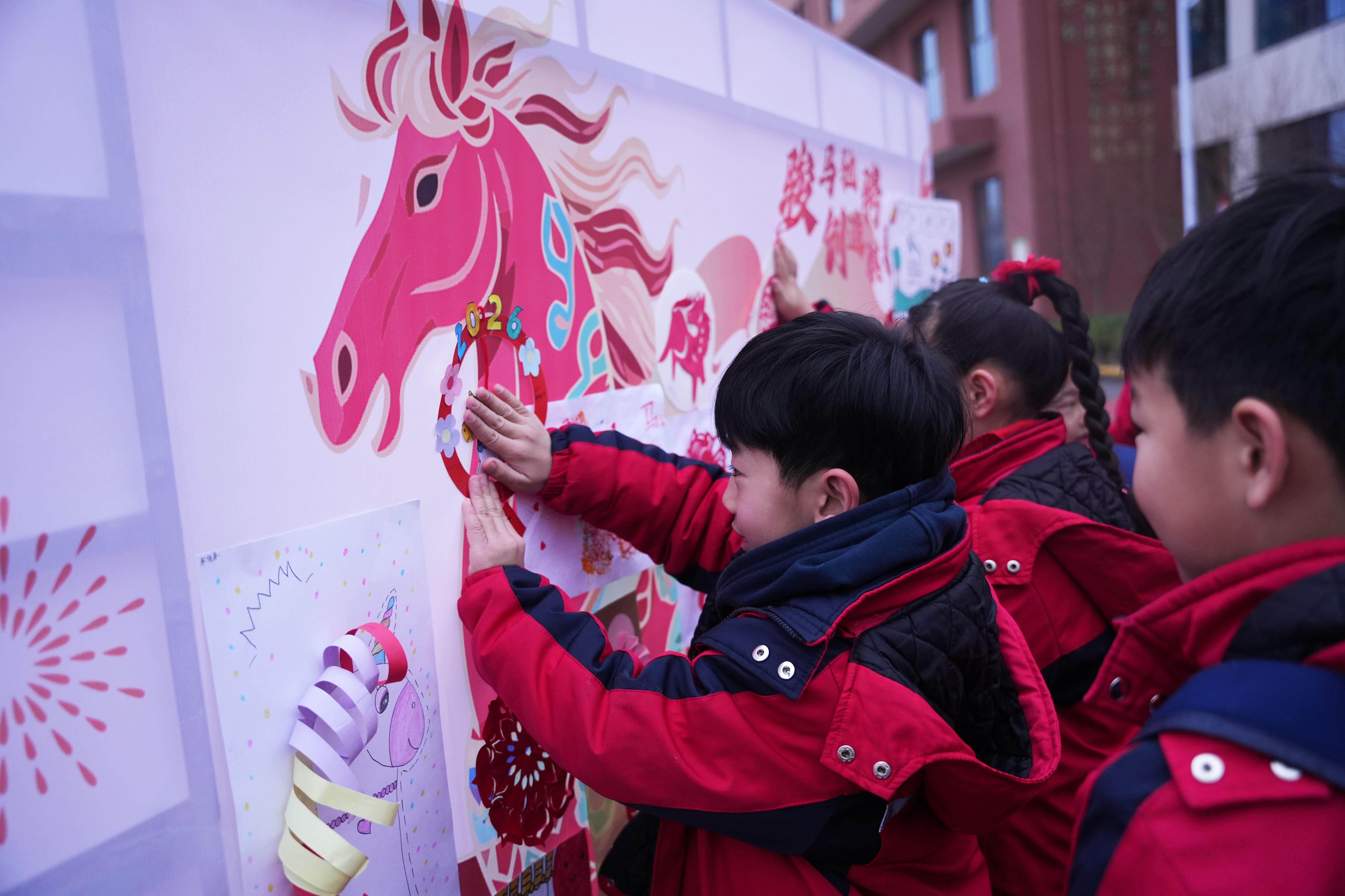 隆尧县第五实验小学则在校门口布置了温馨的欢迎场景,学校领导班子与吉祥物玩偶一同迎接返校学生,一声声亲切的问候和一个个温暖的笑容,让学生们在温馨氛围中感受校园关怀,以愉悦心情迈入新学期。校园内,“骏马驰骋 创造骐骥”主题巨型幕布格外引人注目,学生们手持亲手制作的小马主题作品,认真粘贴在幕布上,汇聚成一幅意气风发的骏马图景,展现了他们的动手实践能力和奋勇争先的精神风貌。