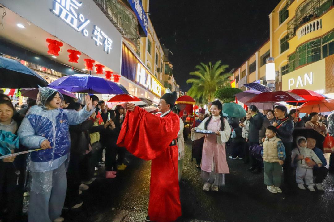 7点整,随着震天锣鼓响起,七大非遗方阵依次出发。龙狮方阵打头阵,金龙翻腾、雄狮起舞,动作精彩,引得市民阵阵叫好;采茶戏演员手持彩扇,舞步轻盈,一曲《春景天》唱出浓郁客家风情;风趣的媒婆形象扭着步子上场,表情夸张、动作逗乐,现场笑声不断。