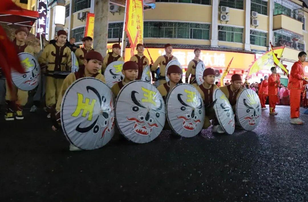 巡游队伍里,明代南安知府巡游方阵格外引人注目。“知府”与衙役沿街行礼喊话,祝福风调雨顺、国泰民安,让大家仿佛穿越到古代,沉浸式感受元宵盛景。非遗旁牌舞方阵铠甲整齐、气势十足,表演者手持兽纹盾牌,跟着鼓点变换队形,刚劲有力的动作重现古代阵法之神韵,让非遗技艺在街头生动展现。