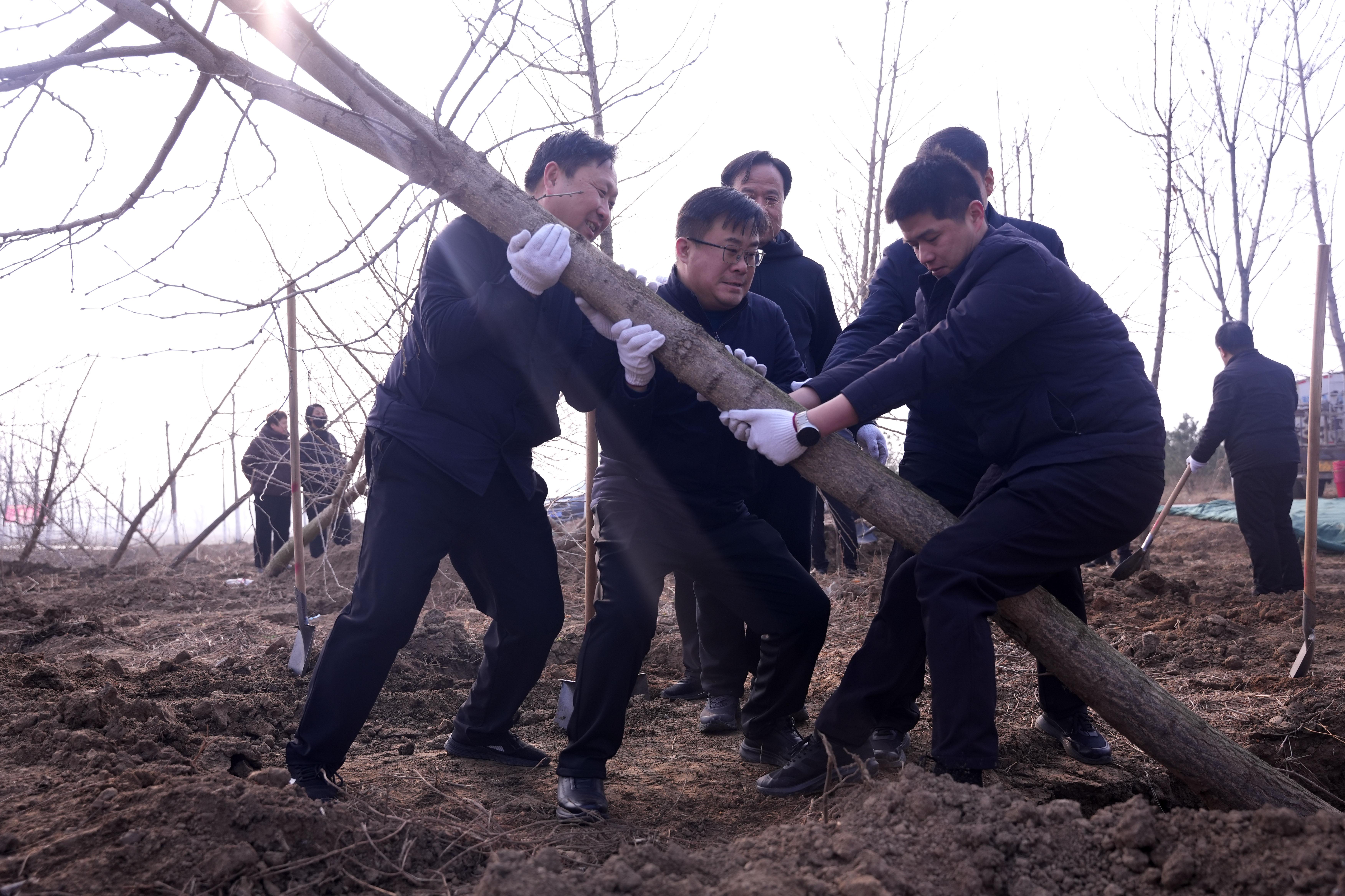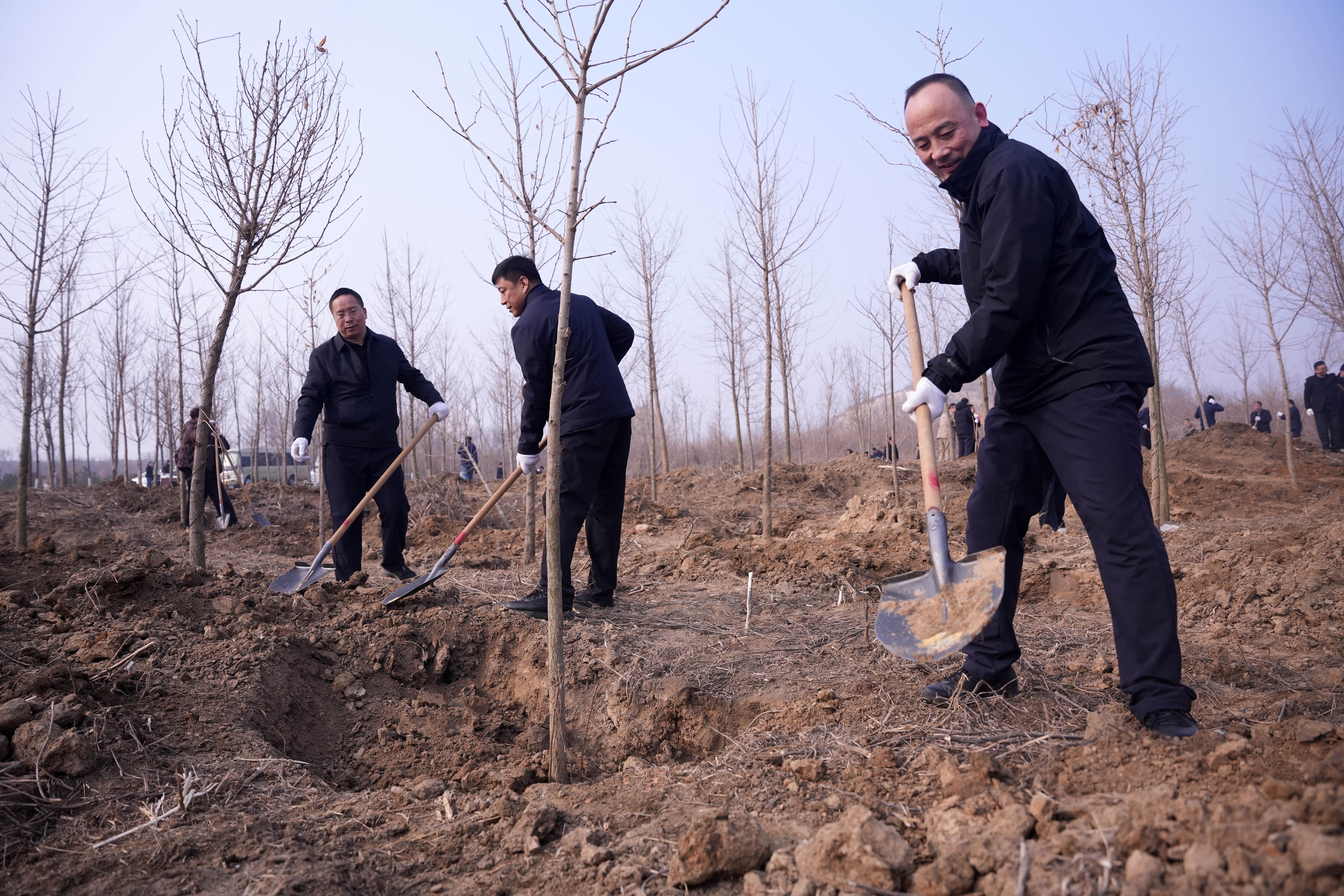 植树现场,大家分工协作,挥锹铲土、扶苗定根、培土压实、浇水灌溉,每一个环节都一丝不苟。一株株银杏树苗迎风挺立,错落有致地扎根在尧山山体之上,当天共计栽种银杏2000余株,为初春的尧山铺就了生机勃勃的生态新景。