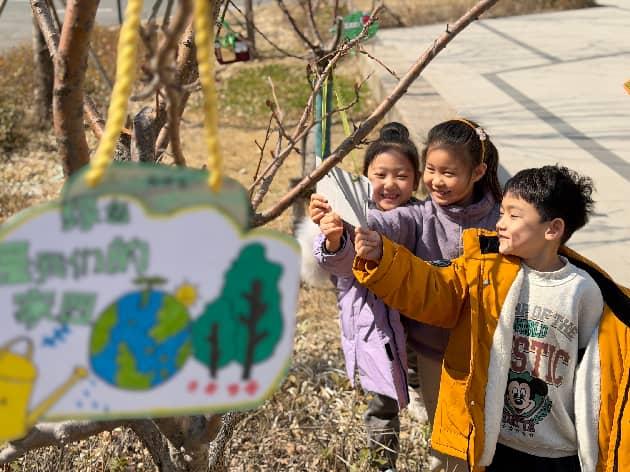 当天下午,孩子们把精心制作的树牌挂上枝头,仿佛把一句句祝福“种”进了春天里。每一块树牌,都是孩子们写给树木的“交友信”。他们踮起脚尖,小心翼翼地将树牌系上,挂好后还要仰头端详许久,仿佛在和新朋友交换眼神,脸上满是成就感。