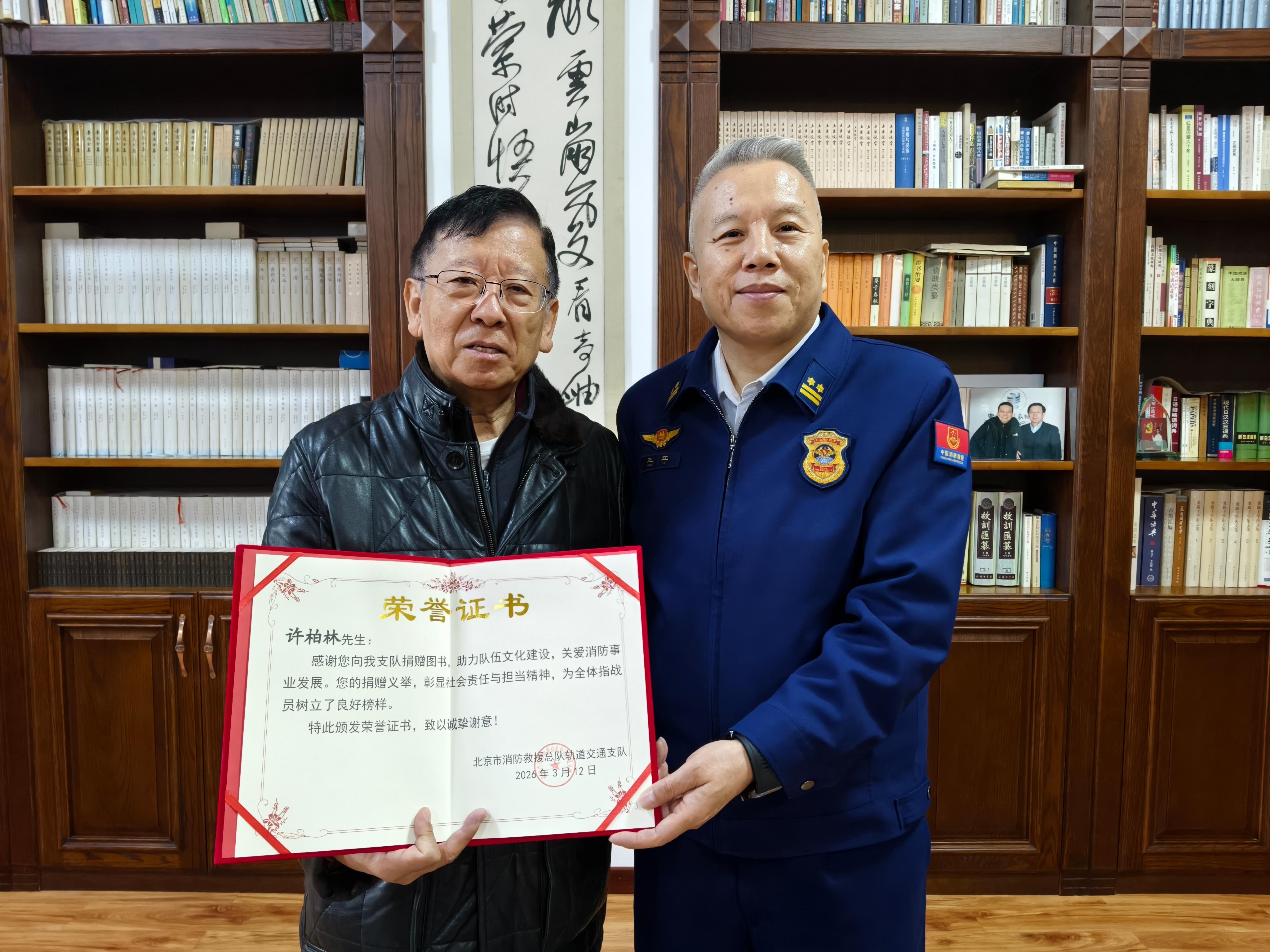 书香传情赋能消防 爱心捐赠温暖人心——许柏林先生向北京市消防救援总队轨道交通支队捐赠图书