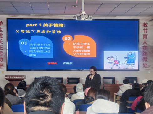 在家长专场讲座中,张向荣老师聚焦家长在教育孩子过程中的困惑,围绕“做父母也需要学习”这一主题,提出了切实可行的建议。她指出,家长应放下焦虑与紧张,学会与孩子有效沟通,让良好的亲子关系成为抵御手机诱惑的“防火墙”。同时,建议家长通过陪伴和正向引导,用积极的行为替代不良习惯,营造温馨和谐的家庭氛围。