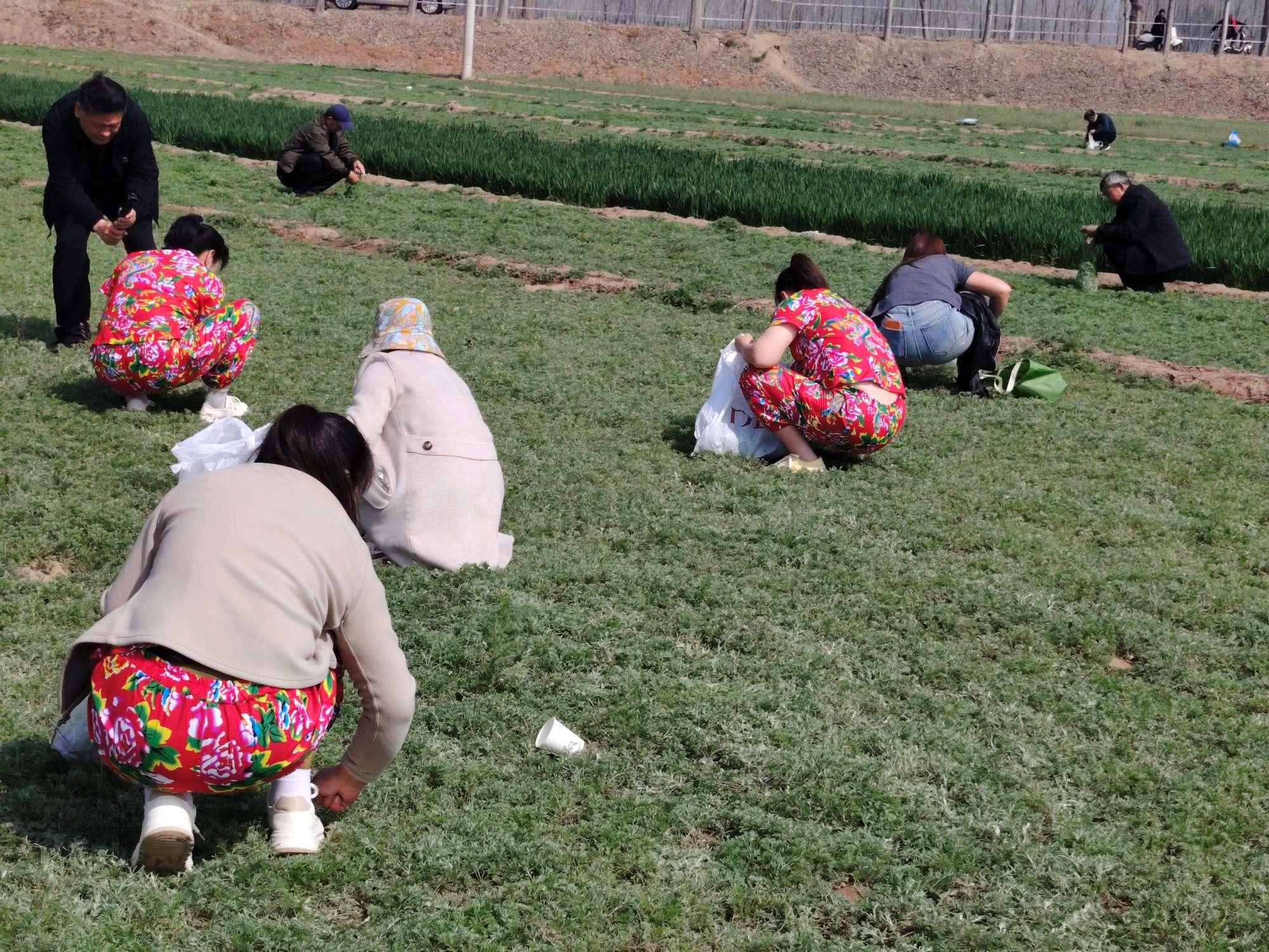 “走,摘茵陈去!”在基地的免费采摘区,村民们挎着竹篮,穿梭在田垄间,指尖轻快地掐下嫩芽。不少从市区赶来的游客带着孩子,兴致勃勃地体验着采摘的乐趣。