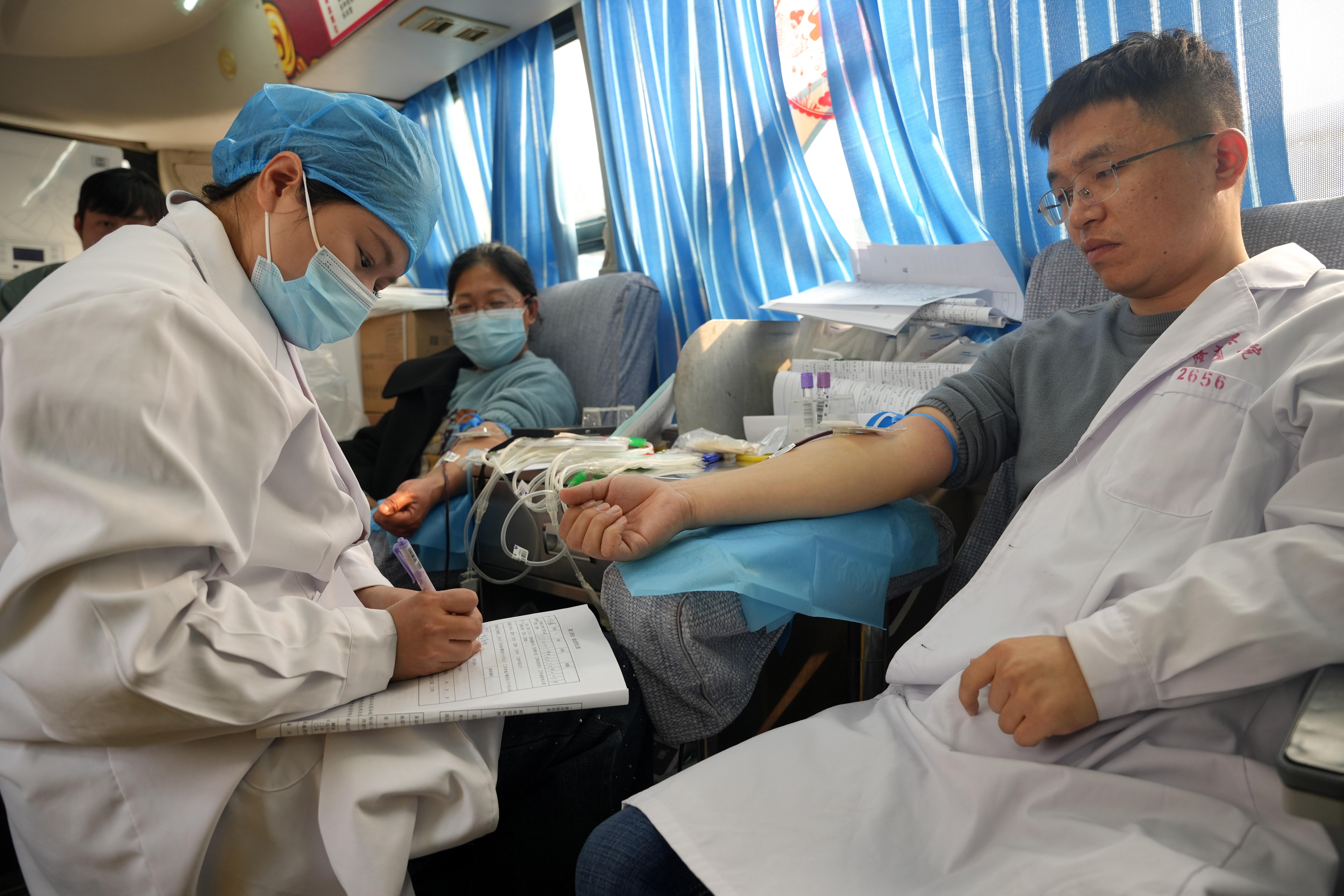 3月24日,河北省隆尧县医院献血车上,医务工作者正在献血。张冬茹 摄