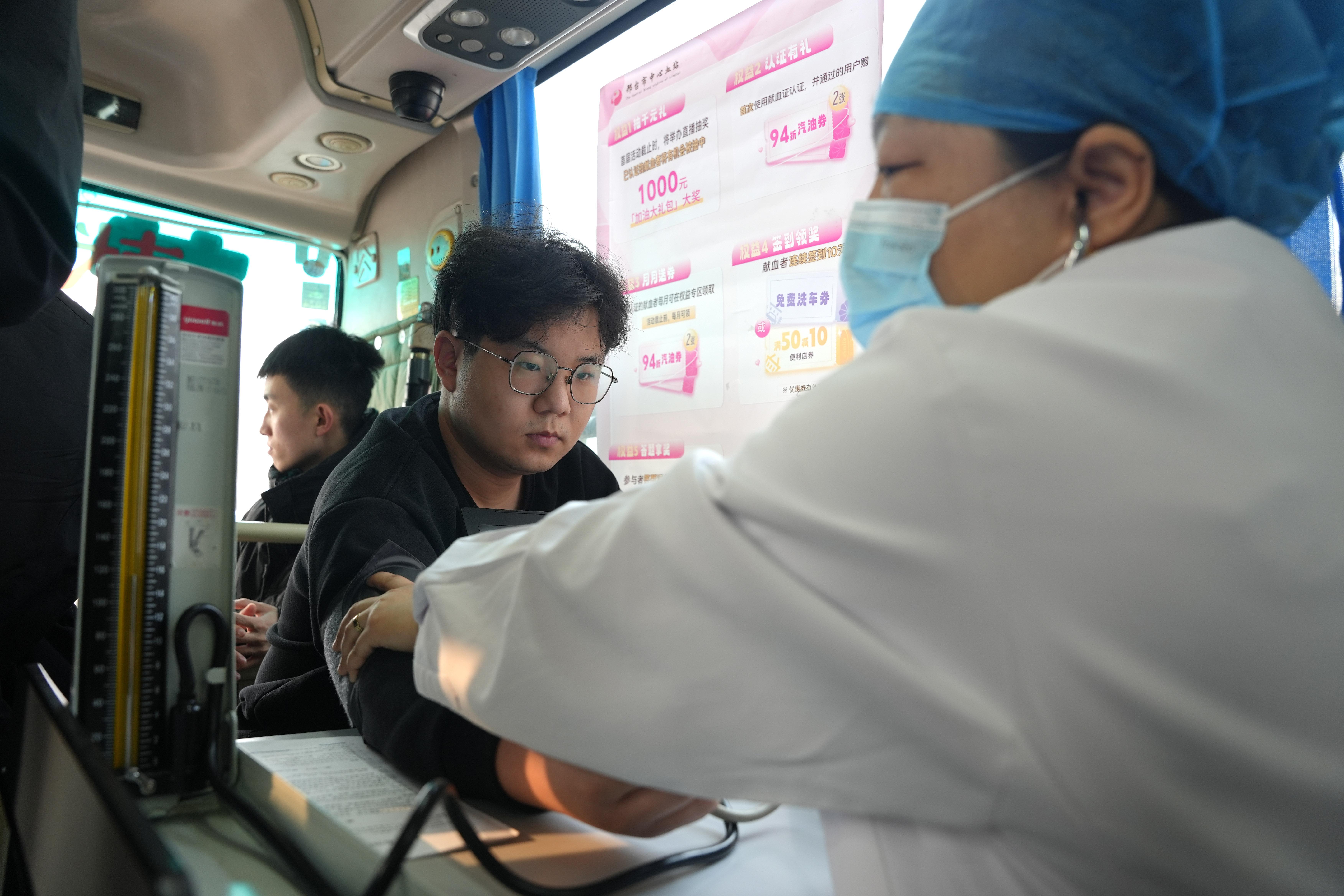 3月24日,河北省隆尧县医院献血车上,献血人员正在测量血压。张冬茹 摄