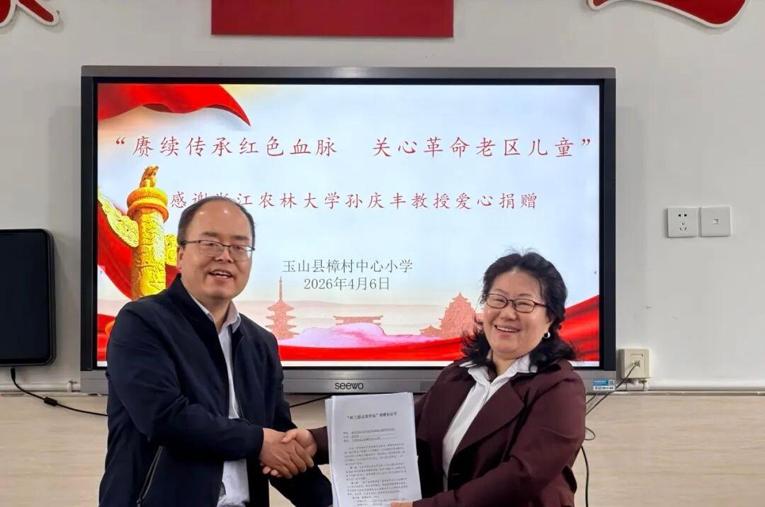 4月6日上午,江西省上饶市玉山县樟村中心小学隆重举行浙江农林大学化材学院——林业工程学科党支部“林工励志奖学金”捐赠仪式。捐赠方代表与樟村中心小学全体校务人员共同见证这场暖心善举。