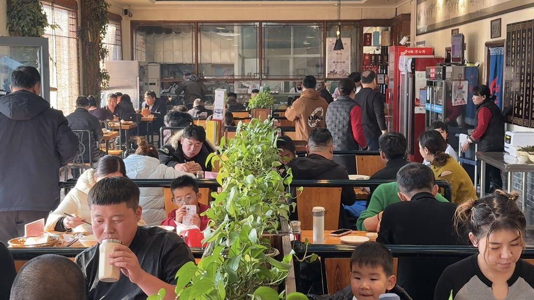 饭店后院,服务员小姐姐从树上采下一篮鲜嫩香甜的榆钱,清洗干净,和进面里。制饼、揉圆,先烙后烤,十几分钟后,金黄酥脆、绿意点缀的榆钱火烧出炉。榆钱的甜香、火烧的焦香、驴肉的卤香交融四溢,饭店大堂里,不同口音的客人早已排起长队。