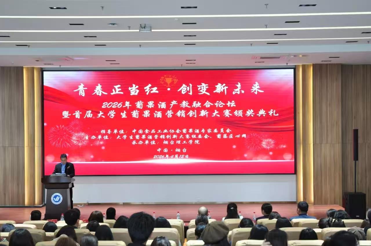 4月12日上午,“青春正当红·创变新未来”2026年葡果酒产教融合论坛暨首届大学生葡果酒营销创新大赛颁奖典礼在烟台理工学院顺利举行。本次活动由中国食品工业协会葡果酒专家委员会指导,相关高校、行业机构共同参与,烟台理工学院经济管理学院承办,全国多所高校师生、行业专家齐聚烟台,共话产业新机遇、共展青年新风采。