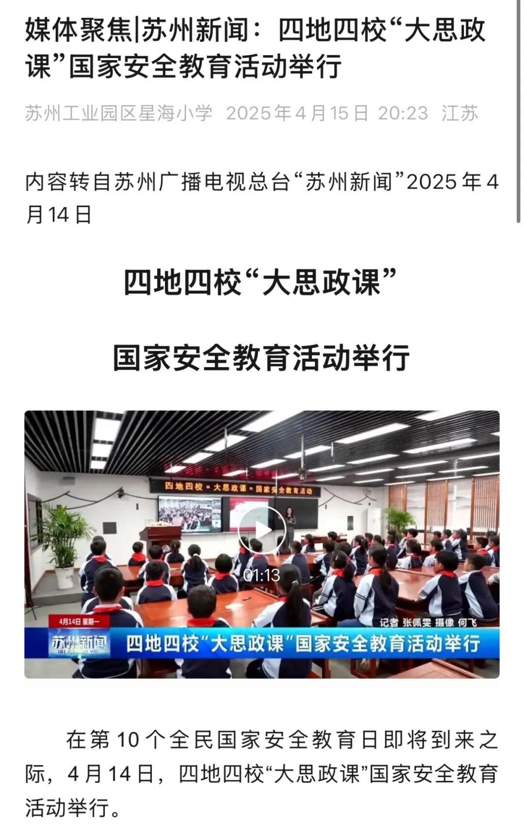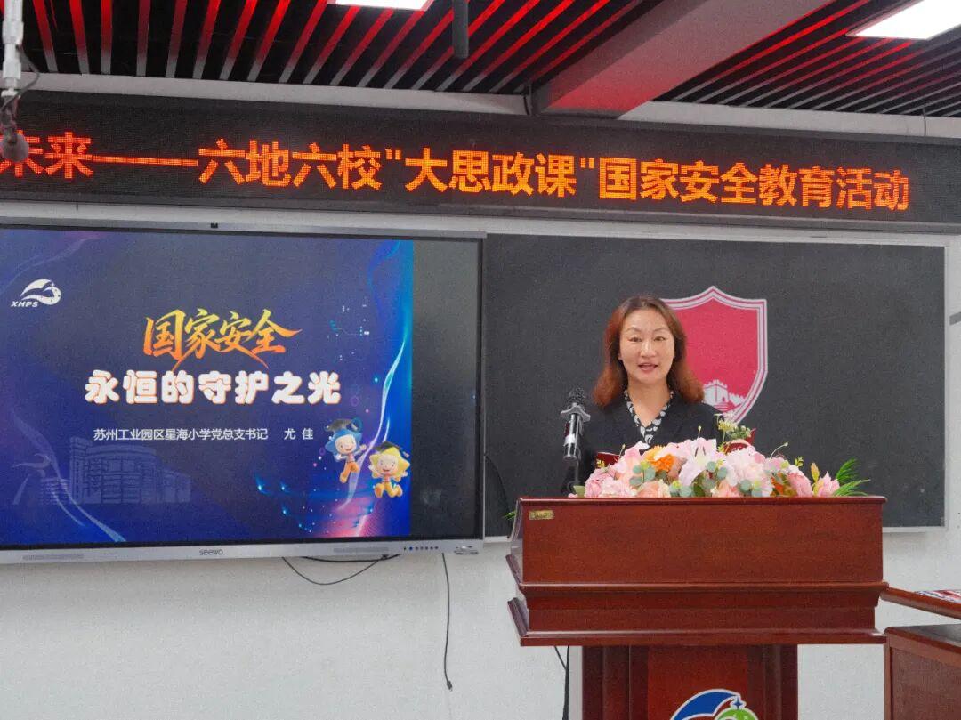 2026年4月15日,在第11个全民国家安全教育日当天,在苏州国家安全教育研究院指导下,苏州工业园区星海小学联合新疆霍尔果斯市丝路小学、雄安容和金源小学、广西钦州市子材小学、吉林长春新区北湖实验学校、延安市安塞区坪桥镇王家湾中心小学,六地六校以云端连线形式,共同开展了“少年担当 国安有我——科技护航我成长”跨区域大思政课活动。星海教育集团师生同步进行线上观摩,共计500余名学生参与其中。