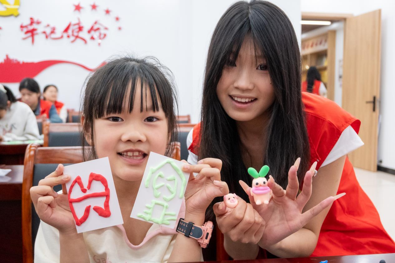 活动现场氛围热烈,甲骨文粘土手工制作环节成为一大亮点。志愿者们结合生动的图文讲解,用通俗易懂的语言为小朋友们介绍甲骨文的发现历程、历史价值及演变逻辑,将原本晦涩的古老文字转化为可触摸、可塑造的文化符号,打破了小朋友们对传统文化的陌生感。在志愿者的指导下,大家拿起彩泥,揉、捏、搓、压,一步步将抽象的甲骨文转化为立体可爱的粘土作品,既还原了古老文字的古朴韵味,更融入了自己对文化的理解,让千年甲骨文在指尖“活”了起来。