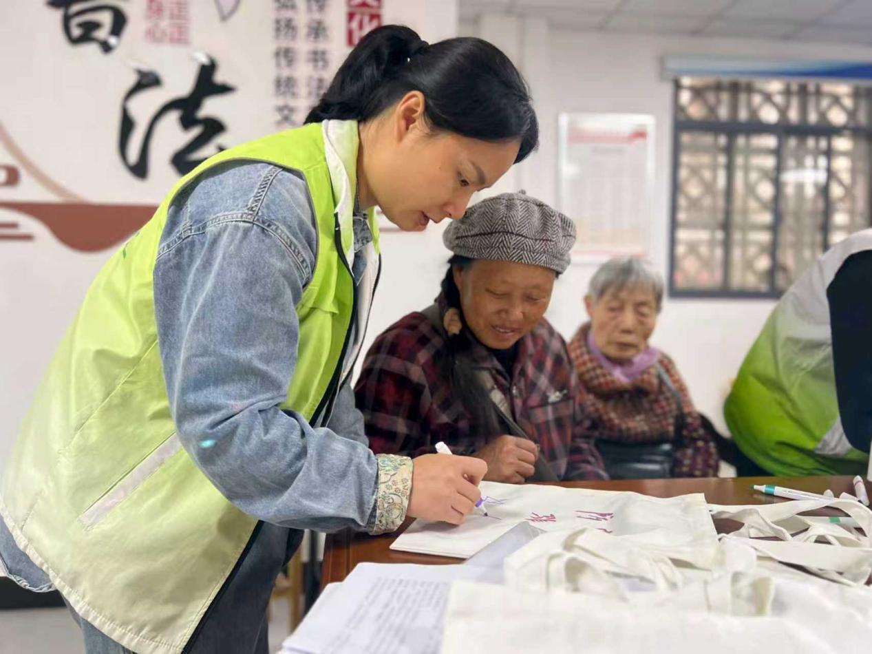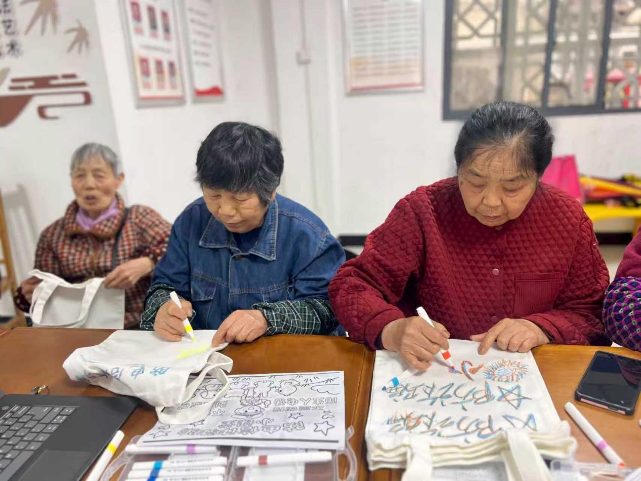 课程中还融入了许多暖心设计。在“情感防骗”课上,社工为老人们准备了空白帆布袋和颜料。老人们一边缝制、手绘防诈标语,一边交流防骗心得。不一会儿,一个个印着“不听不信不转账”“陌生人来电多核实”等标语的帆布袋便制作完成。王阿姨举着自己做的帆布袋,开心地说:“这个袋子我天天买菜都提着,既能装东西,又能随时提醒自己和老姐妹们,真是一举两得!”