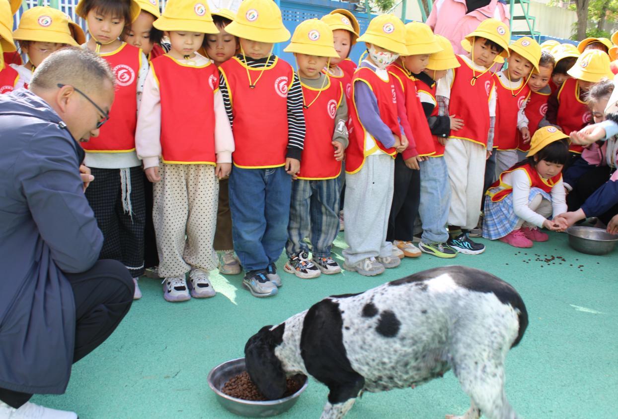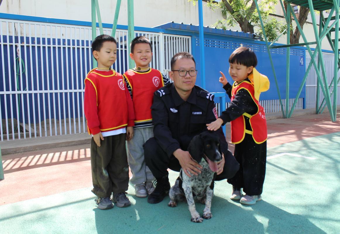 活动现场,在民警与训导员的全程带领下,孩子们有序参观标准化警犬犬舍,近距离认识德国牧羊犬、拉布拉多等工作犬种,详细了解警犬日常饲养管理、生活起居等情况。训导员结合幼儿认知特点,以通俗易懂、生动有趣的语言,科普警犬严格的选拔条件、常态化训练内容,以及搜爆缉毒、治安巡逻、安全防控等工作职责,让孩子们真切了解这群“无言忠诚卫士”在维护辖区平安、守护群众安全中的重要使命。