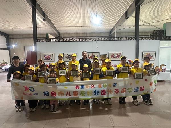 当天上午,孩子们兴致勃勃地走进烟台民生印花艺品有限公司非遗工坊参观,二十四节气、祖国风光、仙境海岸等系列版画作品整齐摆放、琳琅满目。胶东版画将夹缬、灰缬等古老印染技法与绘、画、雕、镂、拓、刻等传统工艺以及现代丝网版画技术巧妙结合,经历了从白纸构图到棉布成画的华丽蝶变。节气系列版画将时节流转与诗意美学完美交融,尽显东方韵味;仙境海岸系列聚焦本土特色,用细腻笔触勾勒山海相依的旖旎景致。孩子们边走边看、争相提问,亲手触摸版画肌理,近距离感知非遗温度,深切领略传统文化的独特魅力。