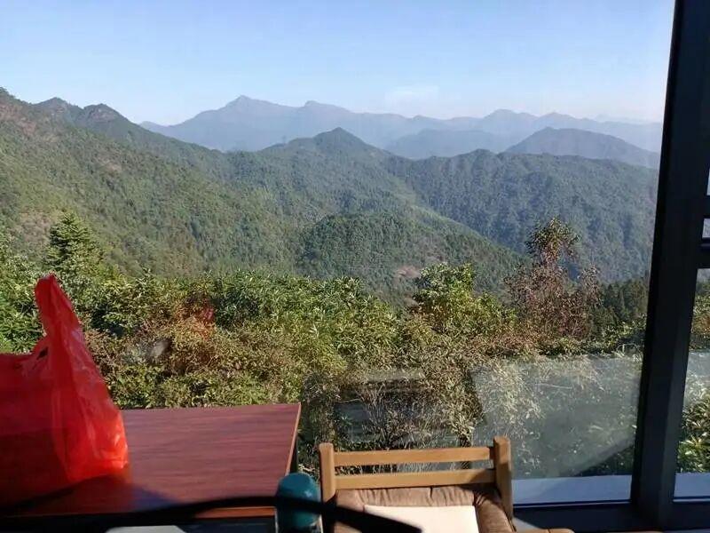 游客在山顶客房内窗外眺望,一览众山小,风景尽收眼里