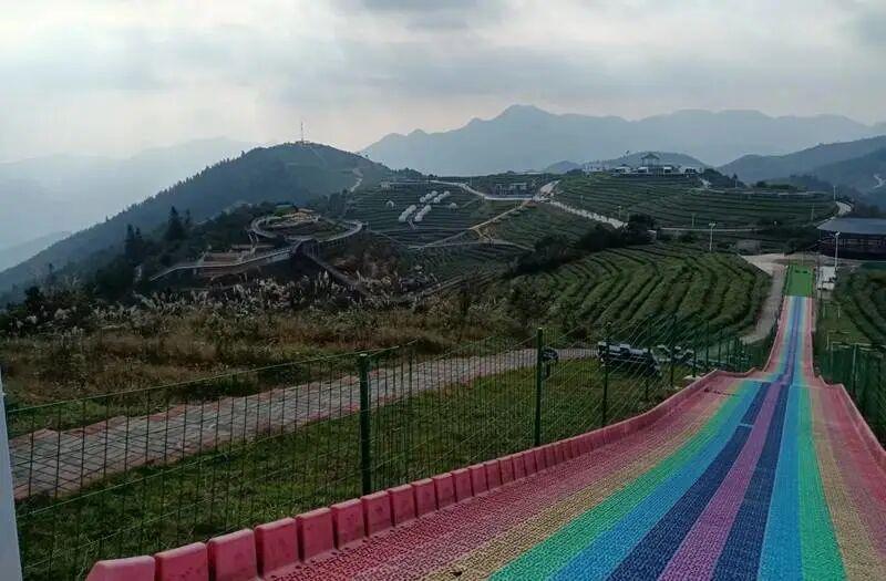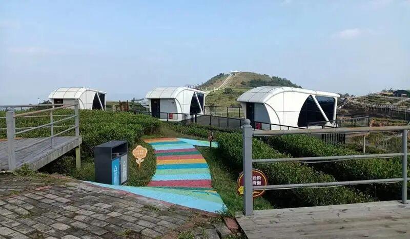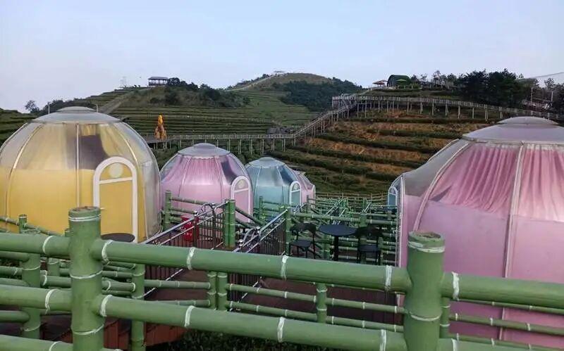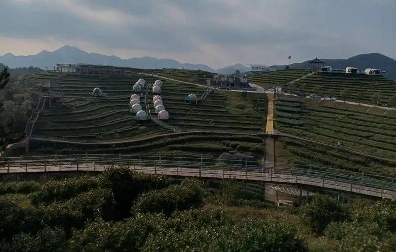 山顶茶园中的游客居住彩色星空房、健身游步栈道